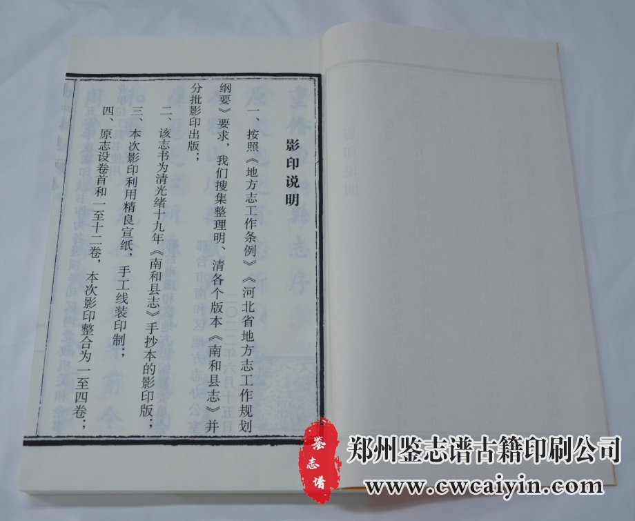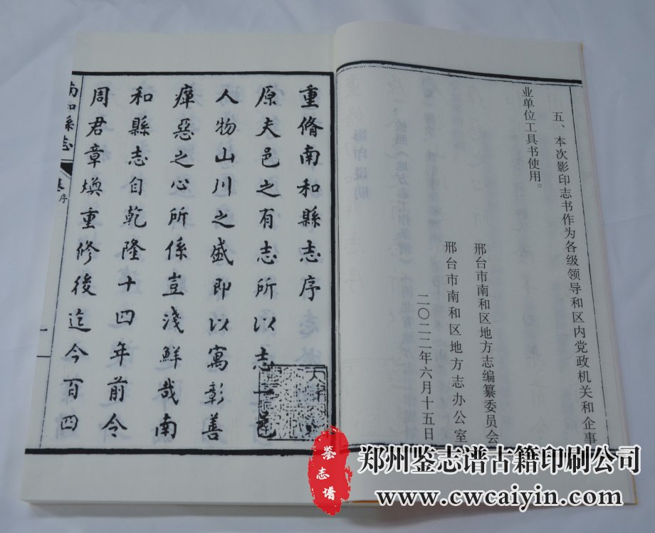 日前,由古籍印刷基地(郑州鉴志谱古籍印刷公司)负责设计排版和印刷的《南和县志(光绪十九年)》顺利交付。该书采用宣纸印刷、古线装订,印刷精美,大气典雅。